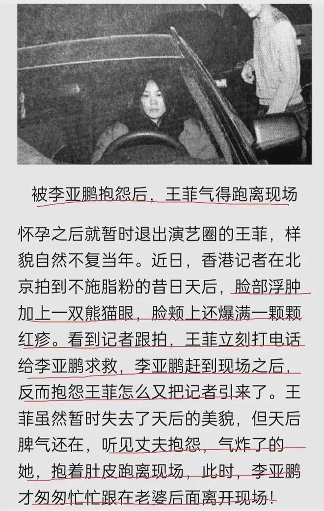 婚后的王菲如小女人般环绕在李亚鹏身边,但网友认为李亚鹏待王菲却不如从前。比如王菲第一次怀孕时,满脸浮肿红疹被拍,他抱怨王菲把狗仔引来。