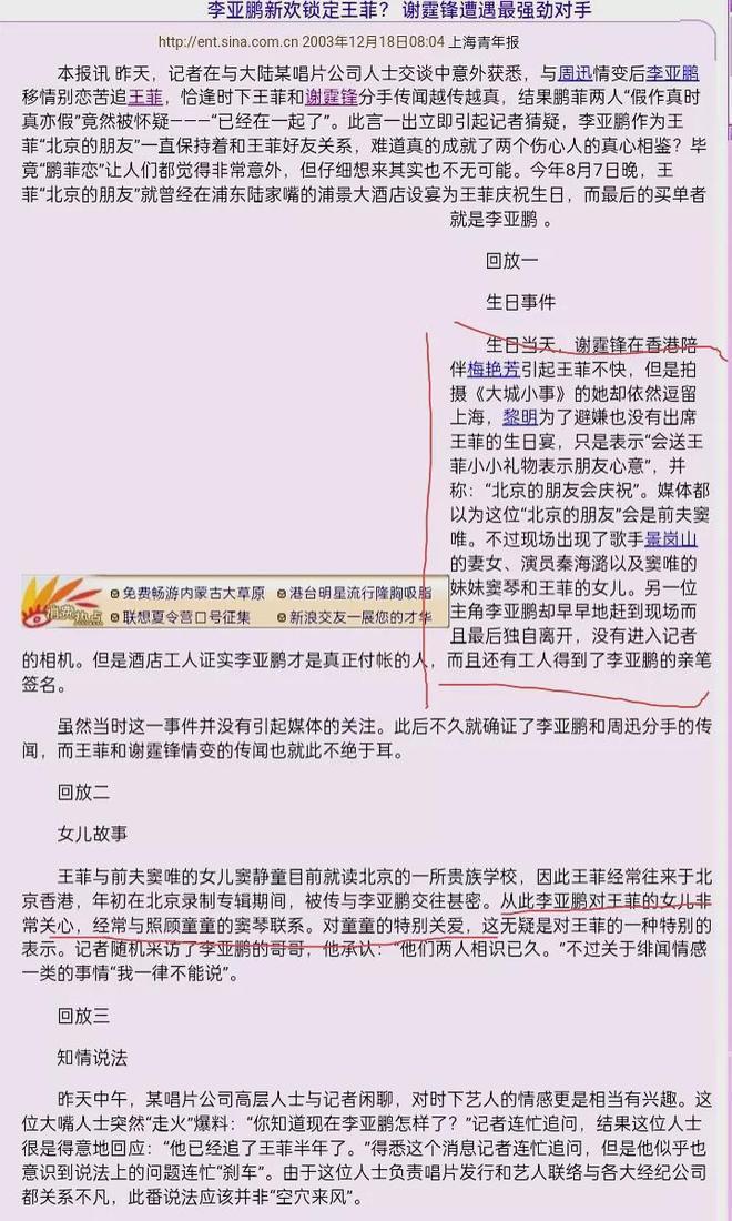 锋菲 2003 年 6 月复合,2003 年 11 月下旬分手。而当时李亚鹏正在狂热的追求王菲,当年 8 月份王菲和北京的朋友在大酒店庆生,最后的买单者就是李亚鹏,而谢霆锋则在香港陪伴梅艳芳,引发王菲不快。
